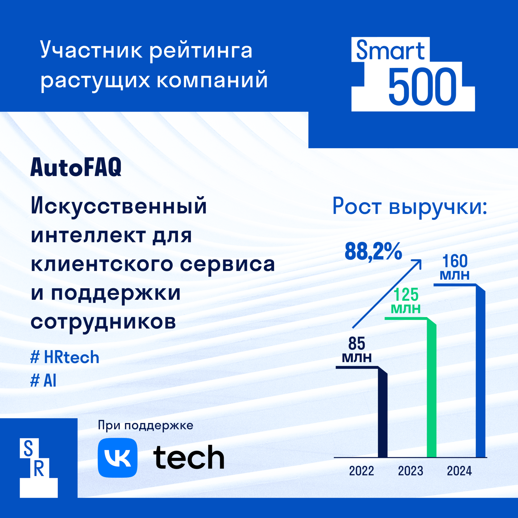 За два года разработчик омниканальных продуктов на базе искусственного интеллекта AutoFAQ увеличил выручку на 88%, заработав 161 млн рублей. У компании больше 60 клиентов, в том числе такие крупные, как «Ростелеком», «Русал», Газпромбанк, «М.Видео-Эльдорадо» и «Честный знак». На развитие проекта повлиял рост интереса корпораций к ИИ-решениям, а также внимание команды к запросам бизнеса.