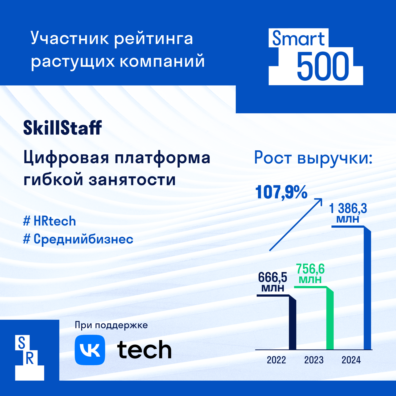 По итогам I квартала 2024 года SkillStaff вошла в топ-10 HR-tech проектов по версии Smart Ranking, а ее выручка за год составила 1386,3 млн рублей.