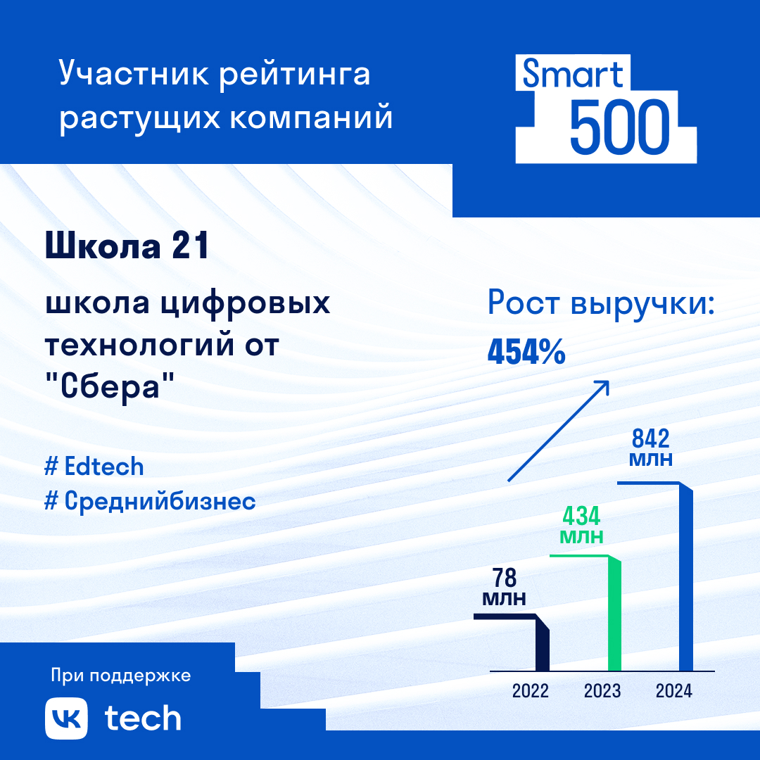 Обучающая программированию, QA, анализу данных и кибербезопасности «Школа 21» за три года сильно увеличила выручку — с 7,69 млн рублей в 2021 году до 842,2 млн рублей в 2024 году. Главными драйверами роста компании стала нехватка квалифицированных IT-специалистов на российском рынке и развитие сотрудничества как с корпоративными клиентами, так и с крупнейшими федеральными университетами.